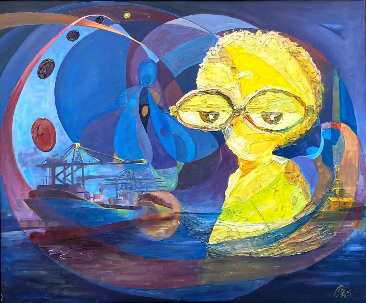 在这幅充满活力的海港画作中,作者赞颂了莱基港的蜕变之旅——从一片贫瘠的沙滩,蝶变为一个繁忙的海运物流中心。曾经了无生机的地貌,如今随着港口与世界的联结而展现出旺盛的生命力。作者以大胆且富有表现力的色彩——生动的红、蓝与黄,捕捉港口的蓬勃生机,集装箱与船只仿佛承载着进步的故事。画布上的肌理呼应着这片土地最初的粗粝,而明亮的色调则映照出其演变的华美与活力。画作中的港口机械及船只,并非是冰冷的,而是鲜活且充满创造力的,驱动着尼日利亚走向更加美好光明的未来。