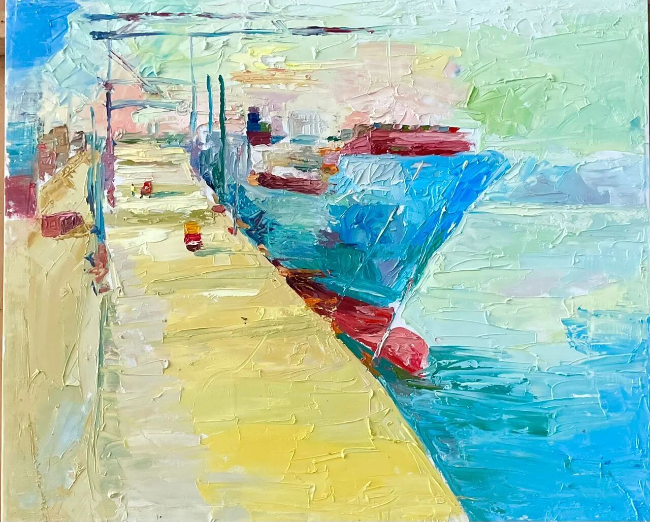 画作以斑斓的色块展现莱基港的壮美景象及其蕴含的蓬勃生机。色彩从暗到亮的渐变,不仅是一种视觉上的渲染,更是象征着一场由无到有的蜕变之旅——港口如何从一片荒芜之地,建设为充满活力的国家门户。